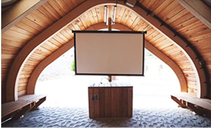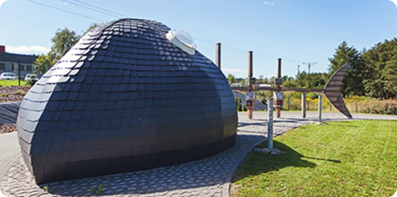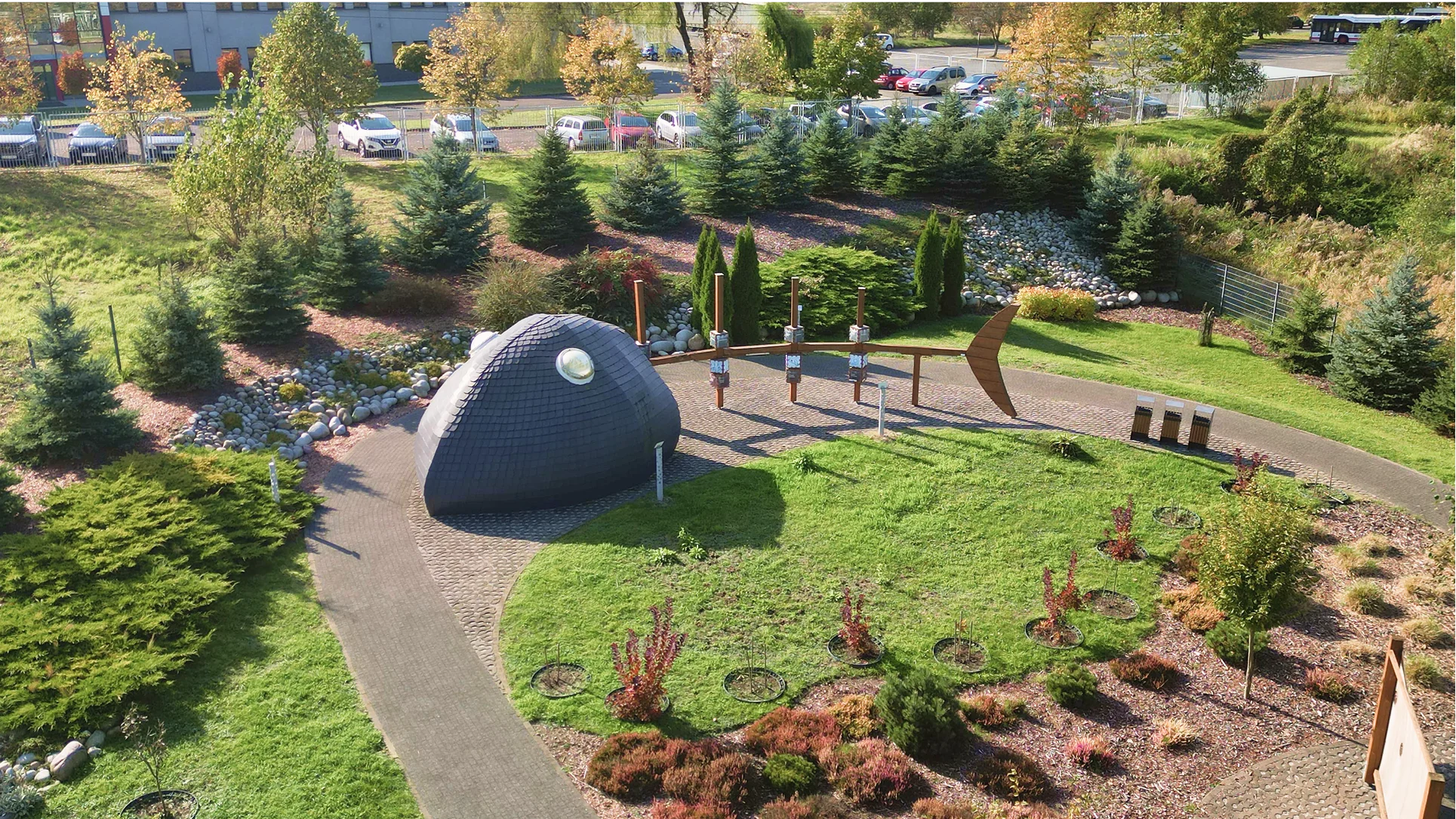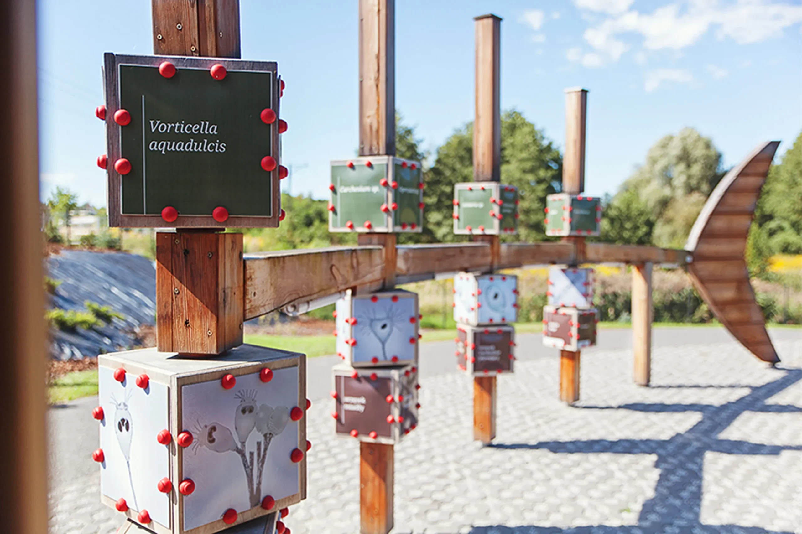 Centralnym punktem ścieżki edukacyjnej jest konstrukcja w kształcie ryby. We wnętrzu głowy znajduje się stanowisko do obserwacji mikroskopowej, a szkielet to gra na ruchomych sześcianach.
