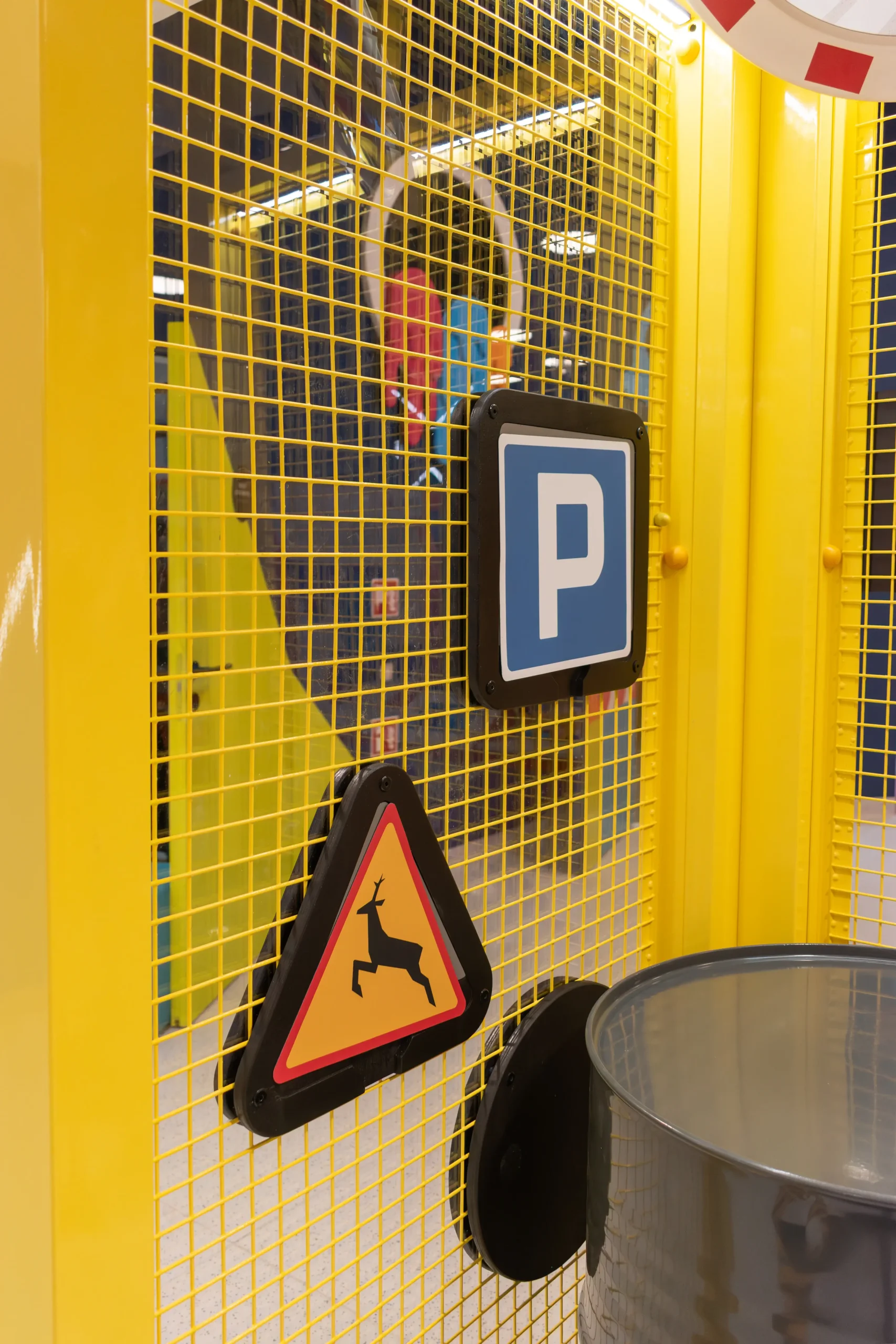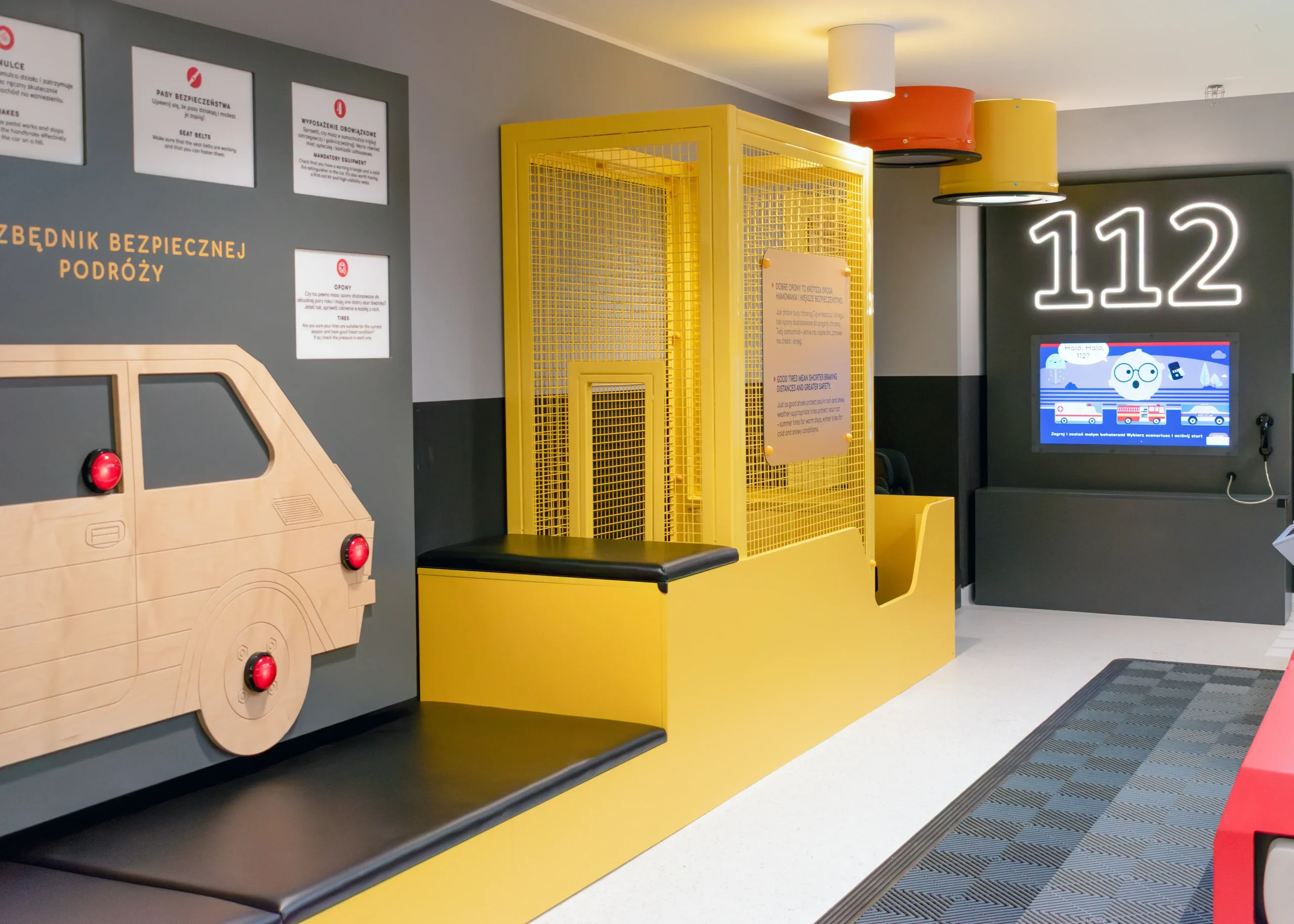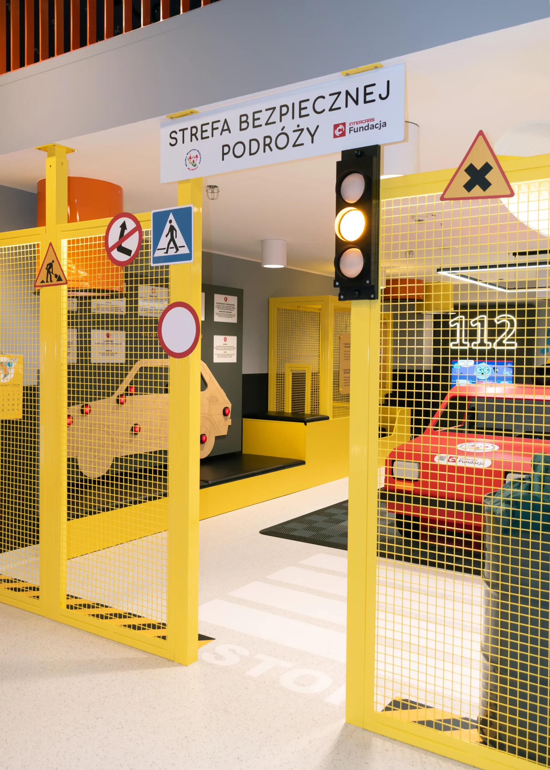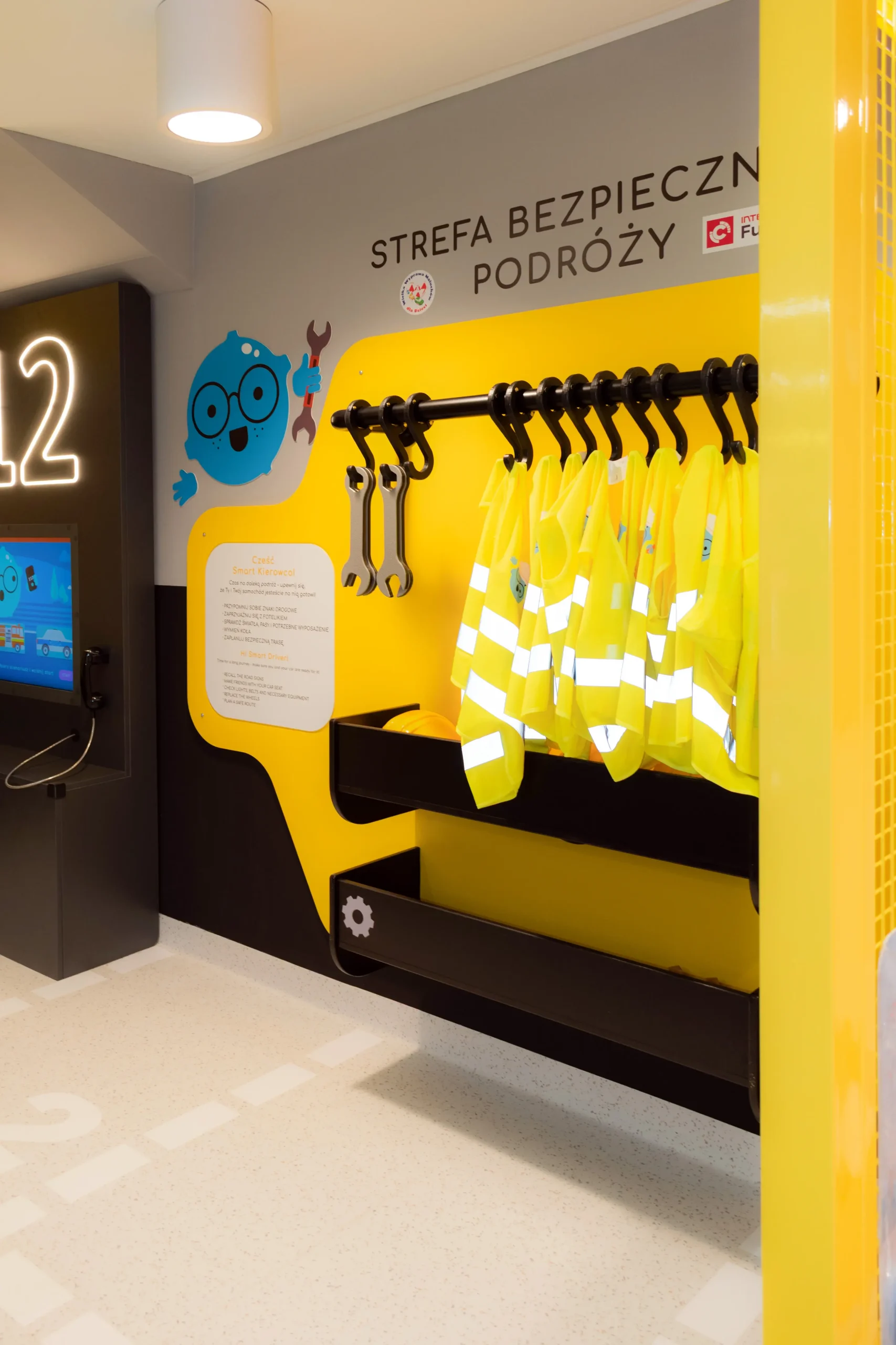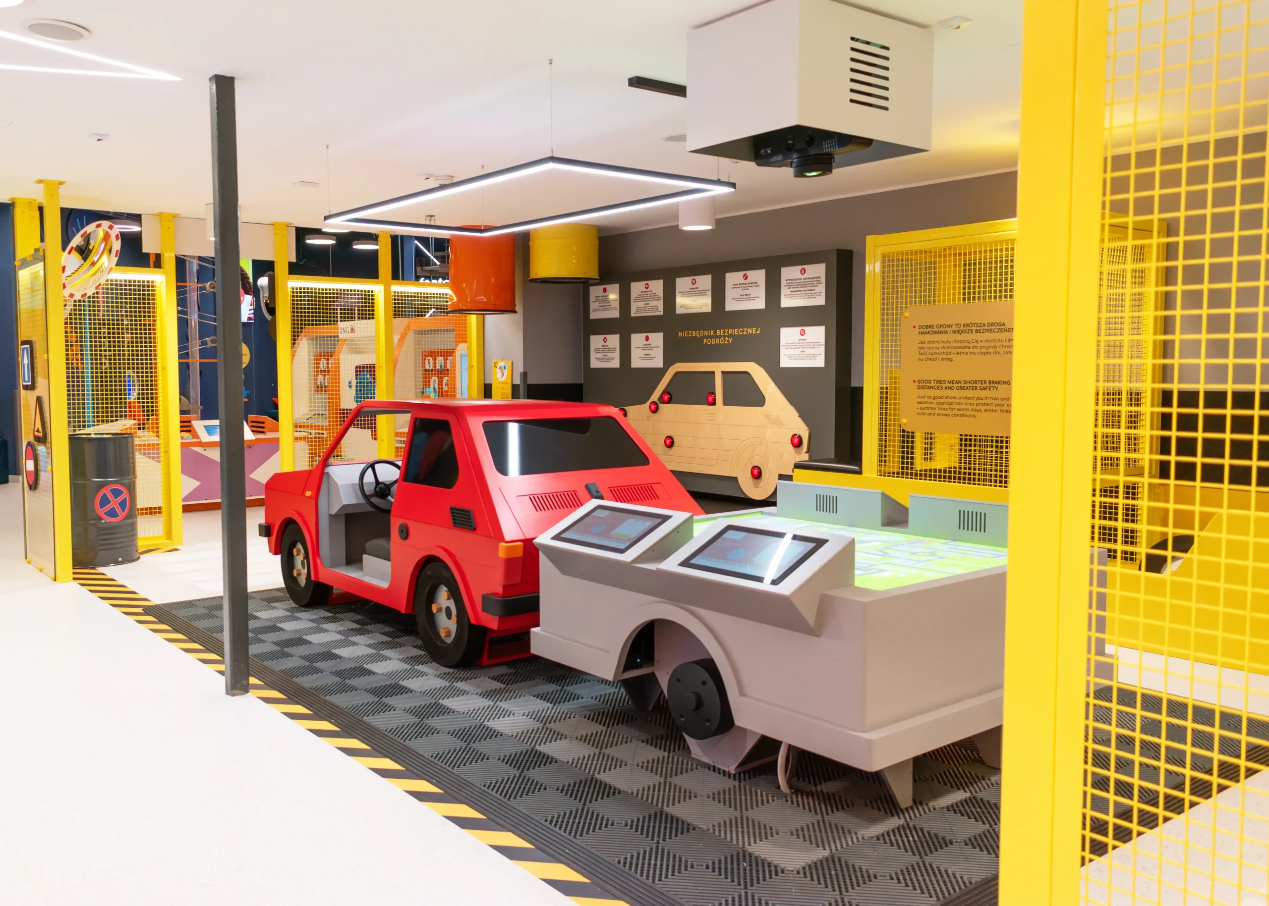 Każdy detal został starannie przemyślany. Zaprojektowaliśmy i wykonaliśmy oświetlenie dopasowane do aktywności dzieci, naklejki podłogowe wyznaczające trasy i zasady ruchu oraz metalowe ścianki, które w bezpieczny sposób wydzielają strefy aktywności. Całość tworzy spójną, atrakcyjną i edukacyjną przestrzeń, w której mali odkrywcy uczą się poprzez zabawę.